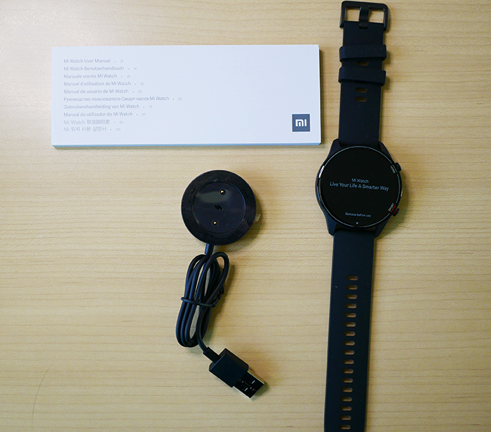 구성품은 매뉴얼, 미워치 본품, 충전 크래들로 구성되어 있으며, 충전기는 포함되어 있지 않아, 별도의 USB 충전기를 구비해야 합니다.