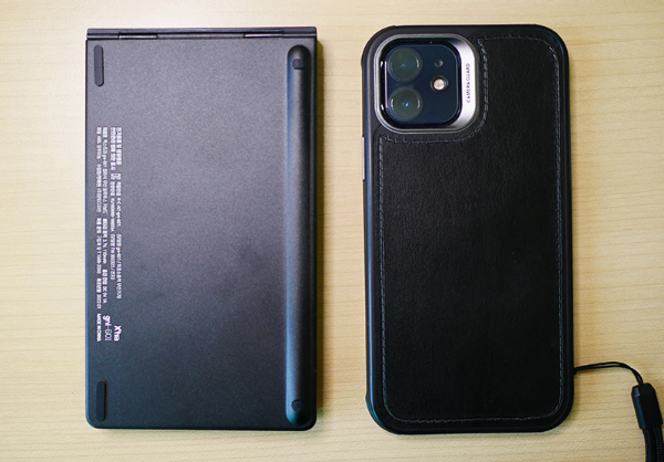 gni-601을 접었을 경우 아이폰12와 사이즈를 비교해도 아주 약간 클 뿐이지 크게 차이가 나지는 않았습니다.