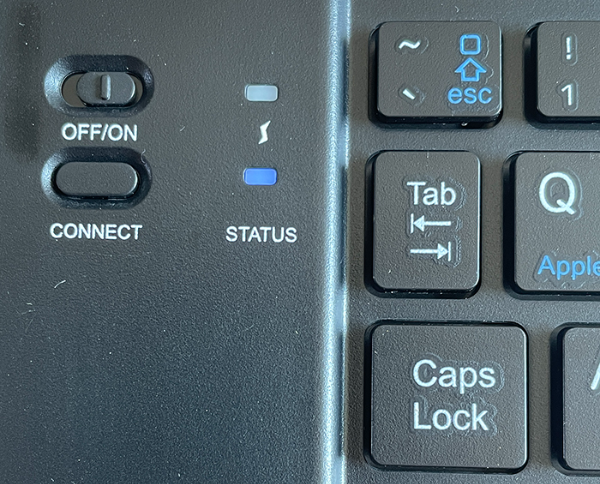 블루투스 키보드의 좌측 상단에는 전원 스위치와 페어링을 위한 connect버튼이 있습니다.