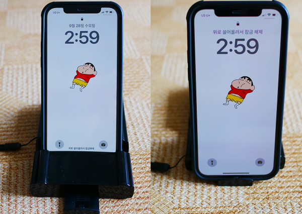 태블릿 PC와 스마트폰을 크래들에 거치한 모습이며, 가로 세로 등 다양하게 거치할 수 있어, 유용하게 사용할 수 있습니다.