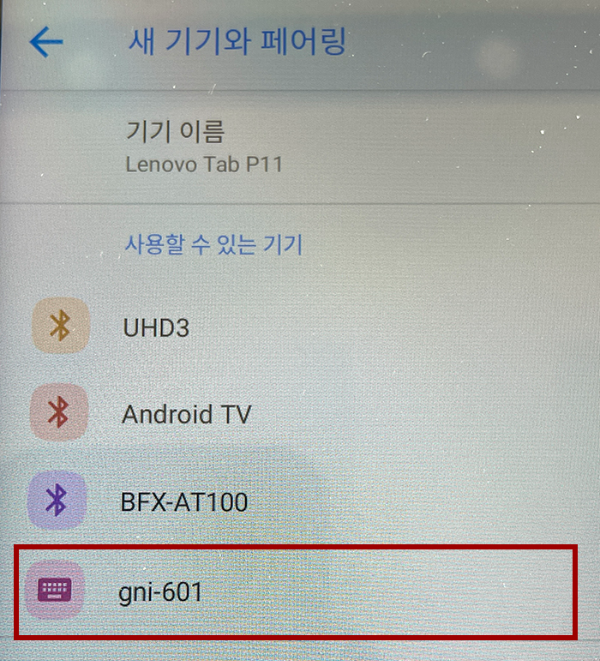 블루투스 키보드에 전원을 인가하고 connect버튼을 누르면 gni-601이라는 모델명이 검색이 됩니다.