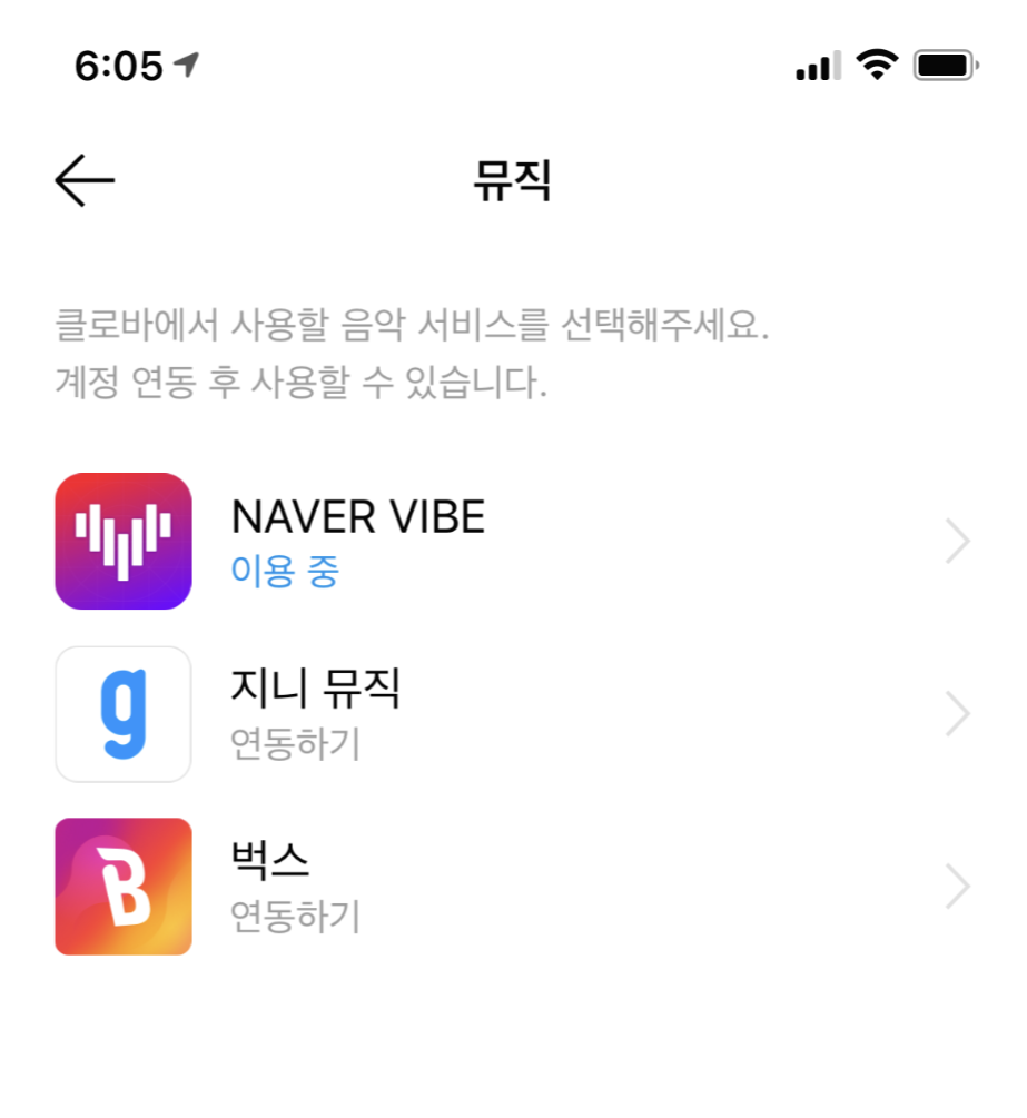 현재 Clova Clock+에 연동할 수 있는 뮤직은 NAVER VIBE, 지니뮤직, 벅스 세가지 밖에는 안됩니다.