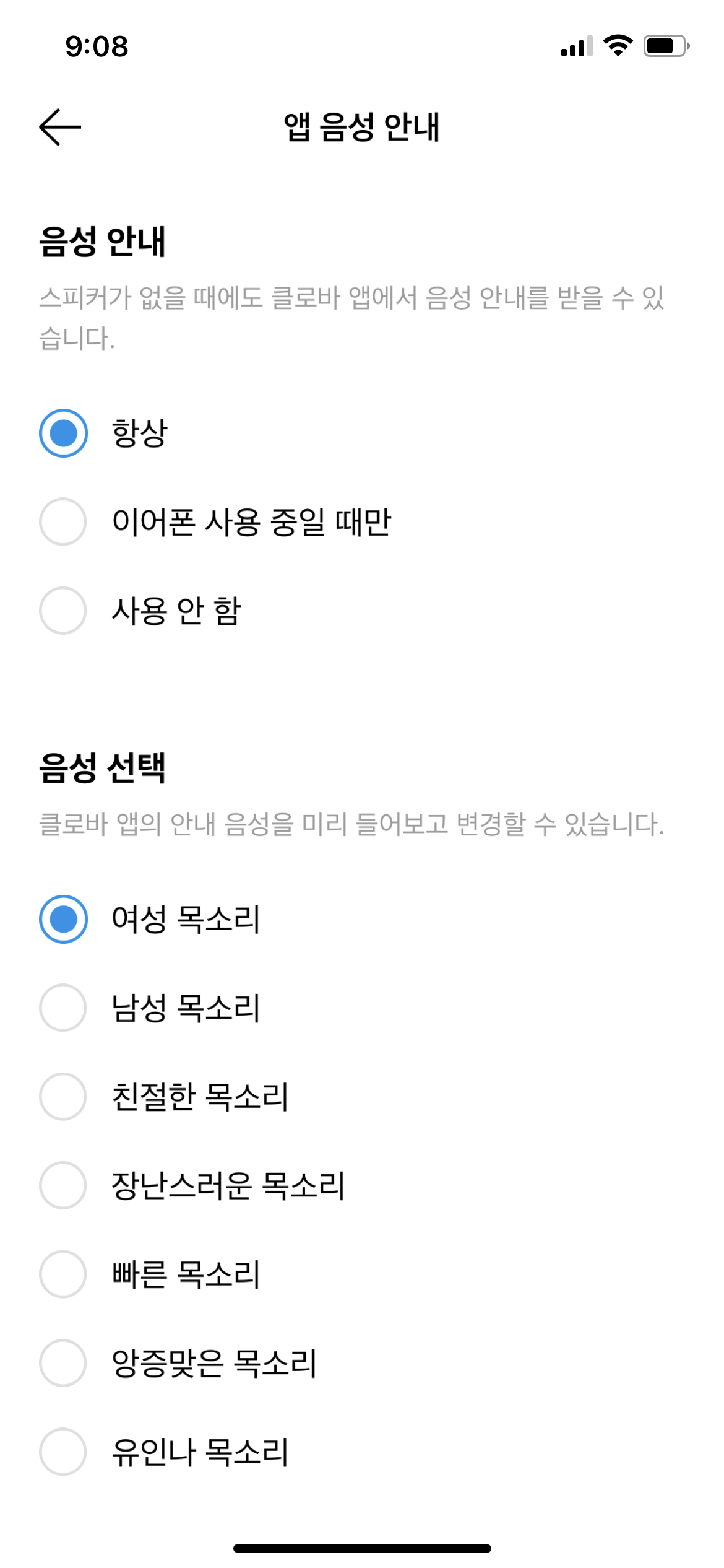 Clock+에서 흘러나오는 음성은 여러가지 목소리로 선택을 할 수도 있습니다.